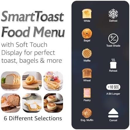 • Touch Screen Panel: Capacitive controls with graphic display let you pick options like Bagel, Waffle, Pastry, or Add 10 Seconds easily. Perfect for a touch screen toaster.