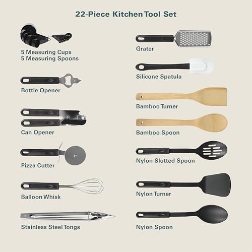 - Starter kitchen set extras: Nylon, bamboo, and silicone utensils, measuring cups, storage bowls, and multiple kitchen accessories cover every cooking task.