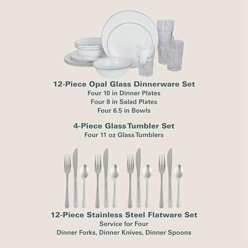 - Complete dinnerware and glassware: Durable opal glass plates and bowls withstand daily use, plus 11oz glass tumblers offer versatile serving for beverages.